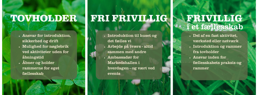 Som fri frivillig hjælper du på tværs af huset. Du får en personlig introduktion til stedet og til tanken om det fælles vi. Du arbejder tæt sammen med de ansatte og andre frivillige, og du er med til at holde huset levende i hverdagen. Du arbejder aldrig alene, og du er en vigtig ambassadør for Markedshallen både i og uden for huset.